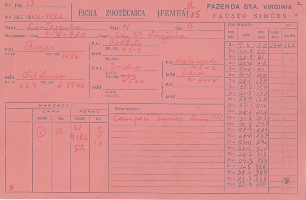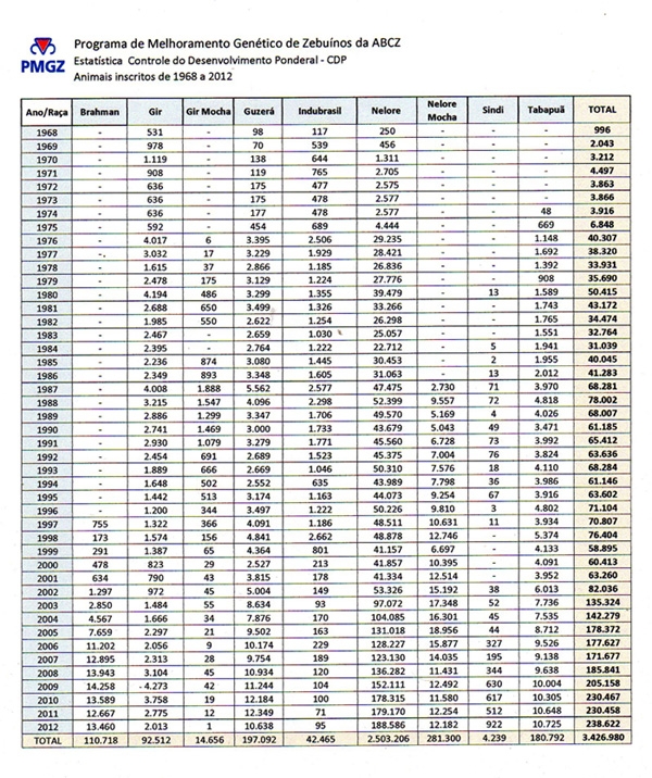 Abaixo a cópia da ficha zootécnica de uma matriz procedente da Fazenda Santa Virgínia, que viera integrar o rebanho da Fazenda Maringá. Note na ficha o Controle de Desenvolvimento Ponderal do ano de 1970. O CDP começou a ser organizado pela ABCZ em 1968. Note que em 1970 havia no Brasil inteiro apenas 1.311 nelores inscritos no CDP. Veja a planilha abaixo: